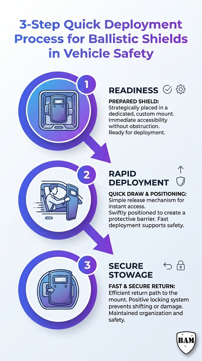 This infographic provides a quick, 3-step guide to deploying ballistic shields in vehicle safety scenarios. It highlights rapid response techniques and protective best practices.