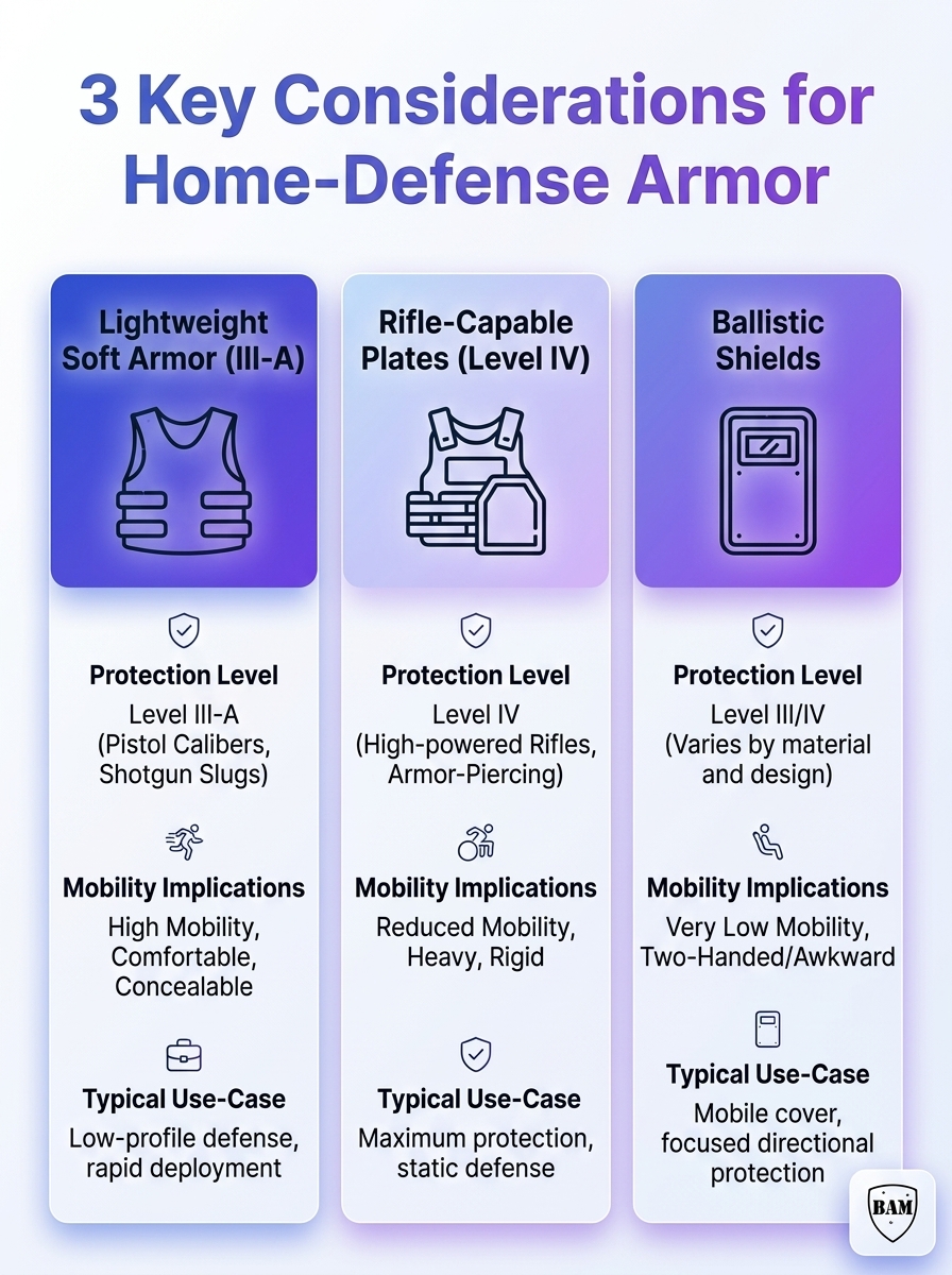 This infographic highlights three key factors to weigh when choosing body armor for home defense: protection, weight, and usability.