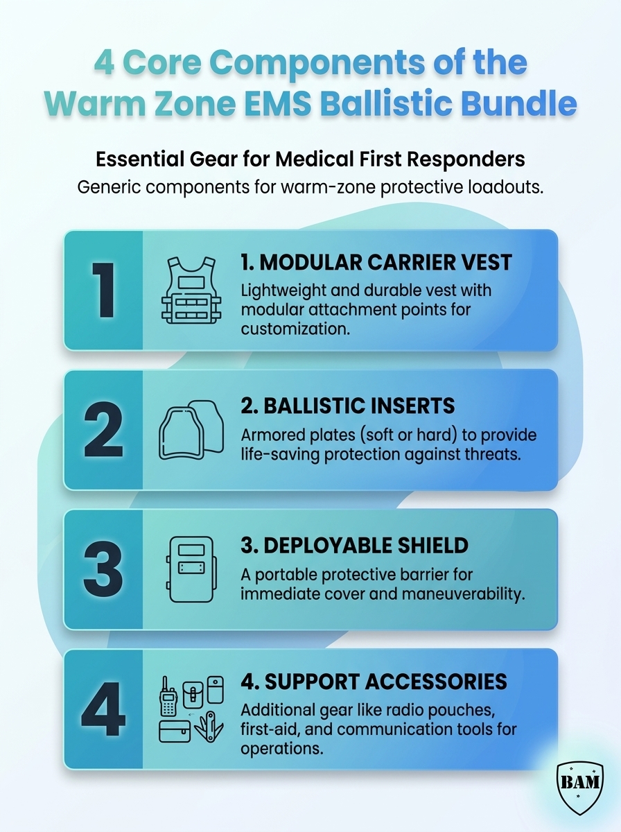 This infographic outlines the four core components of the Warm Zone EMS Ballistic Bundle, helping responders quickly understand how the kit fits into the EMS workflow.